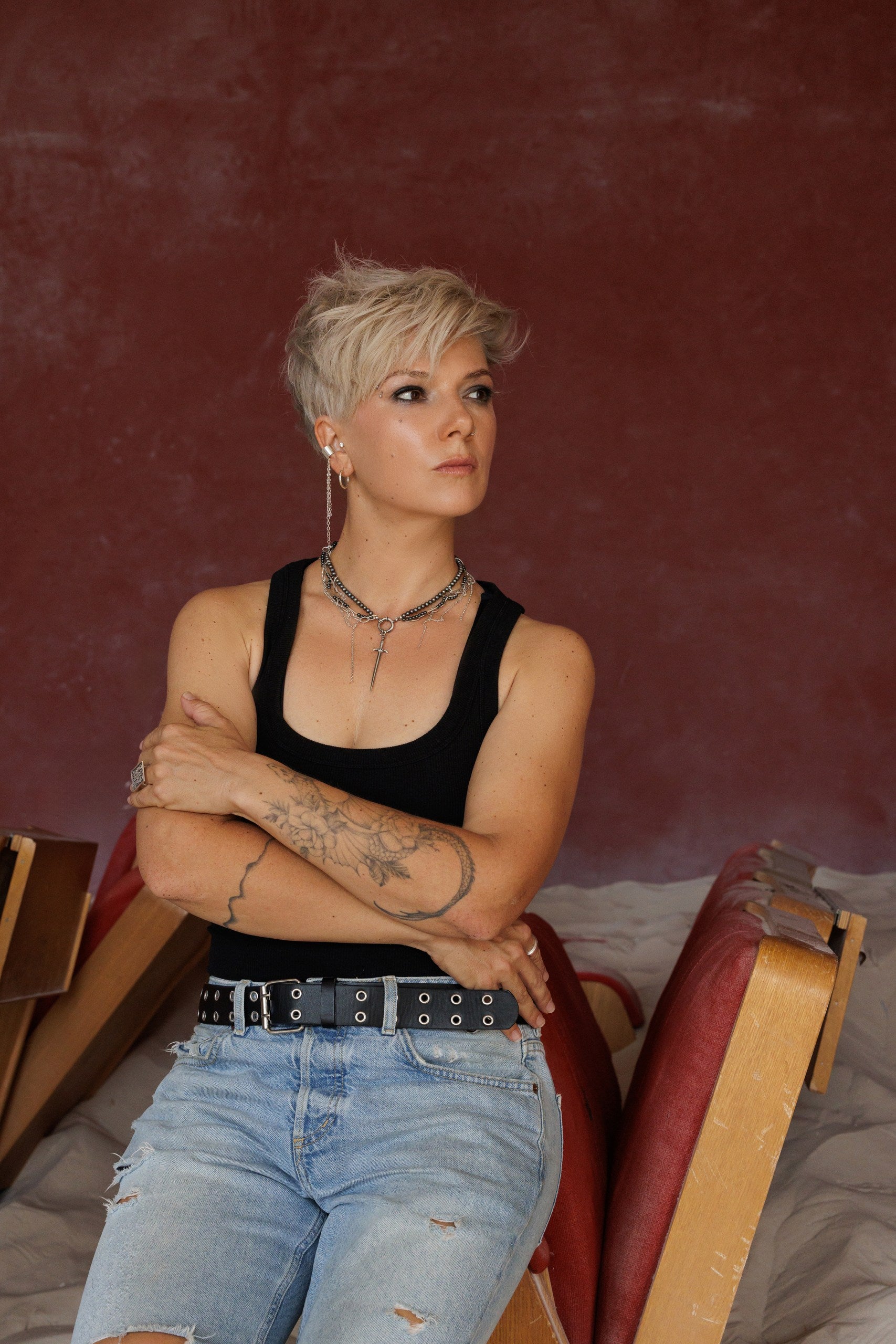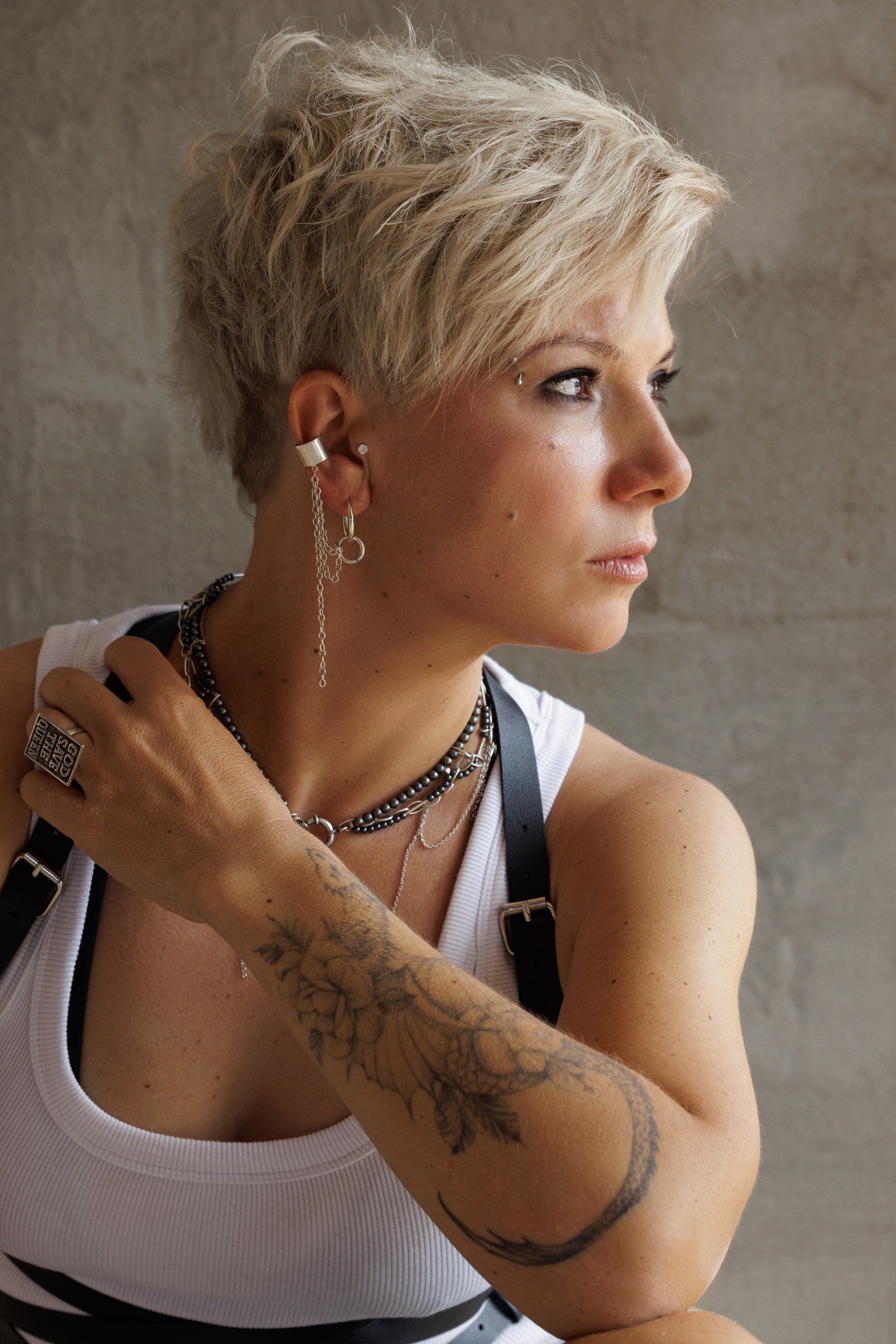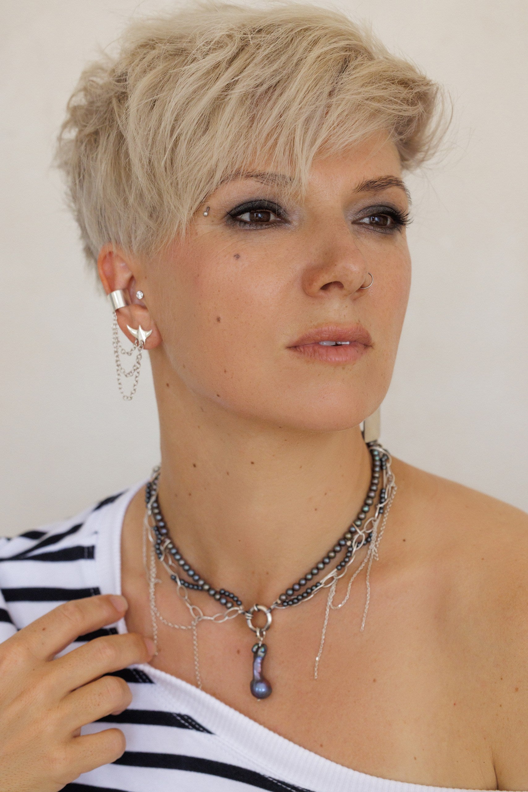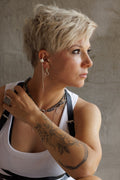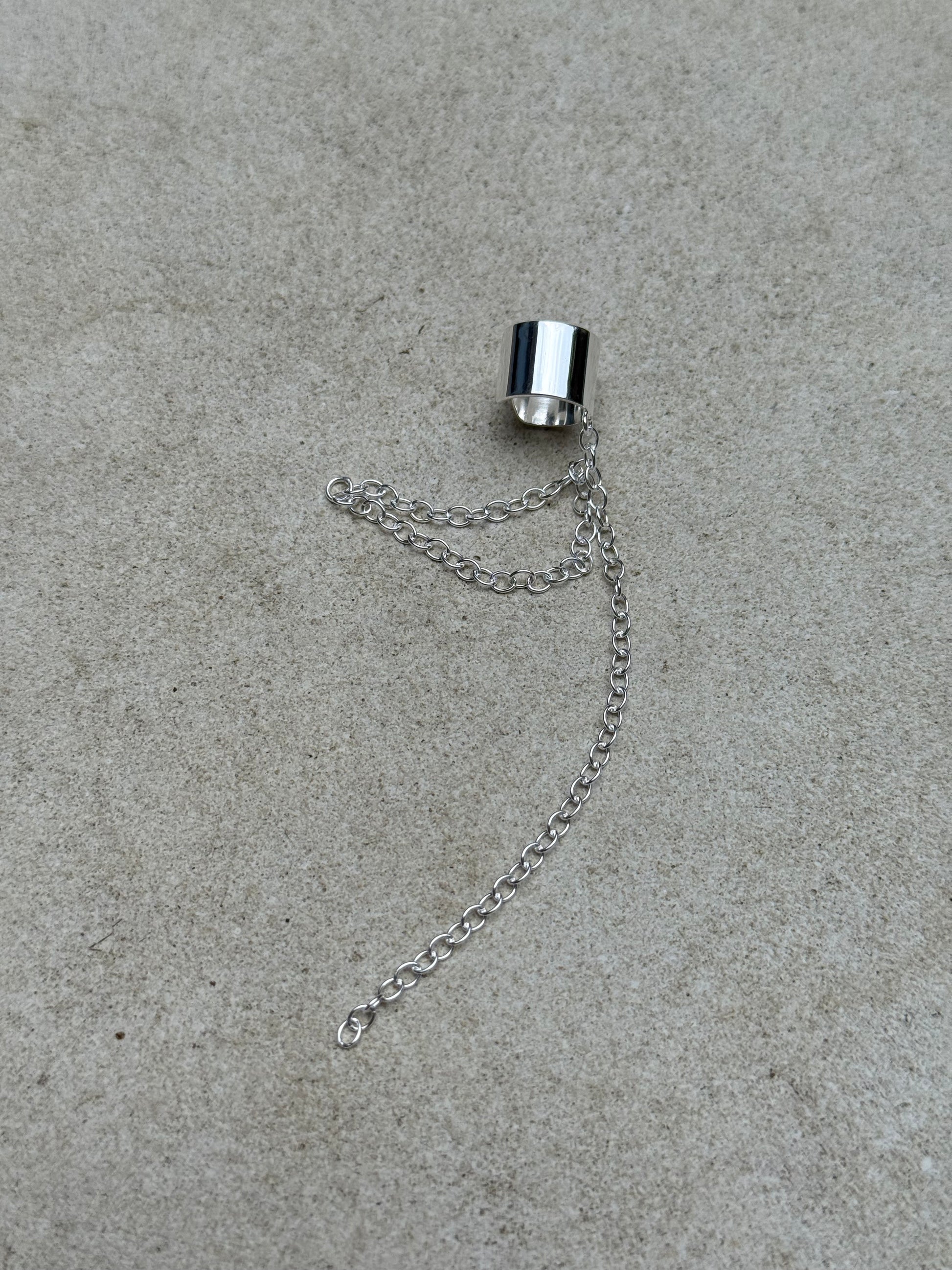 A statement ear cuff with three cascading chains — a true modular piece. Wear it solo, connect one of the chains to an earring, or attach all three for a bold, rebellious look.